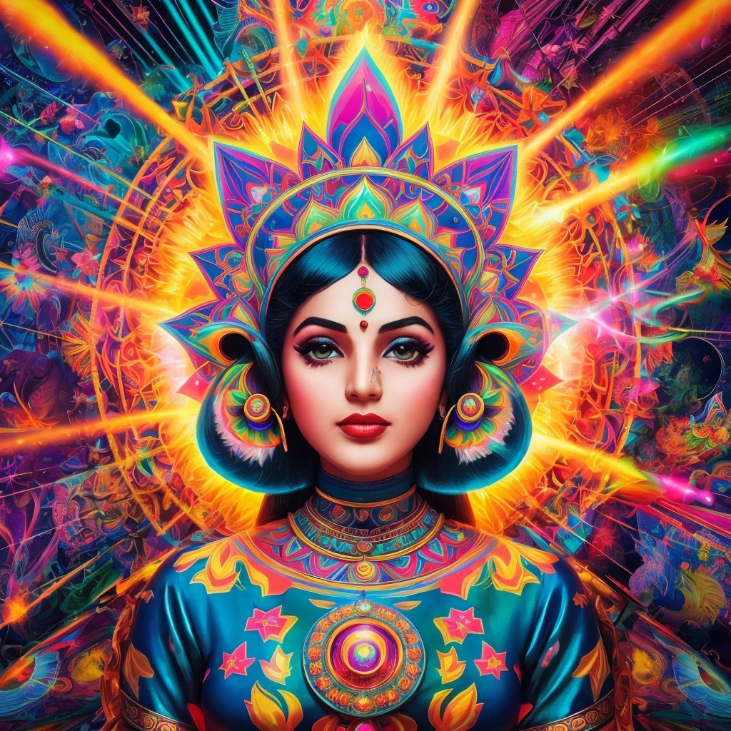 Colorful Psychedelic Female Figure with Indian Adornments and Mandala Halo