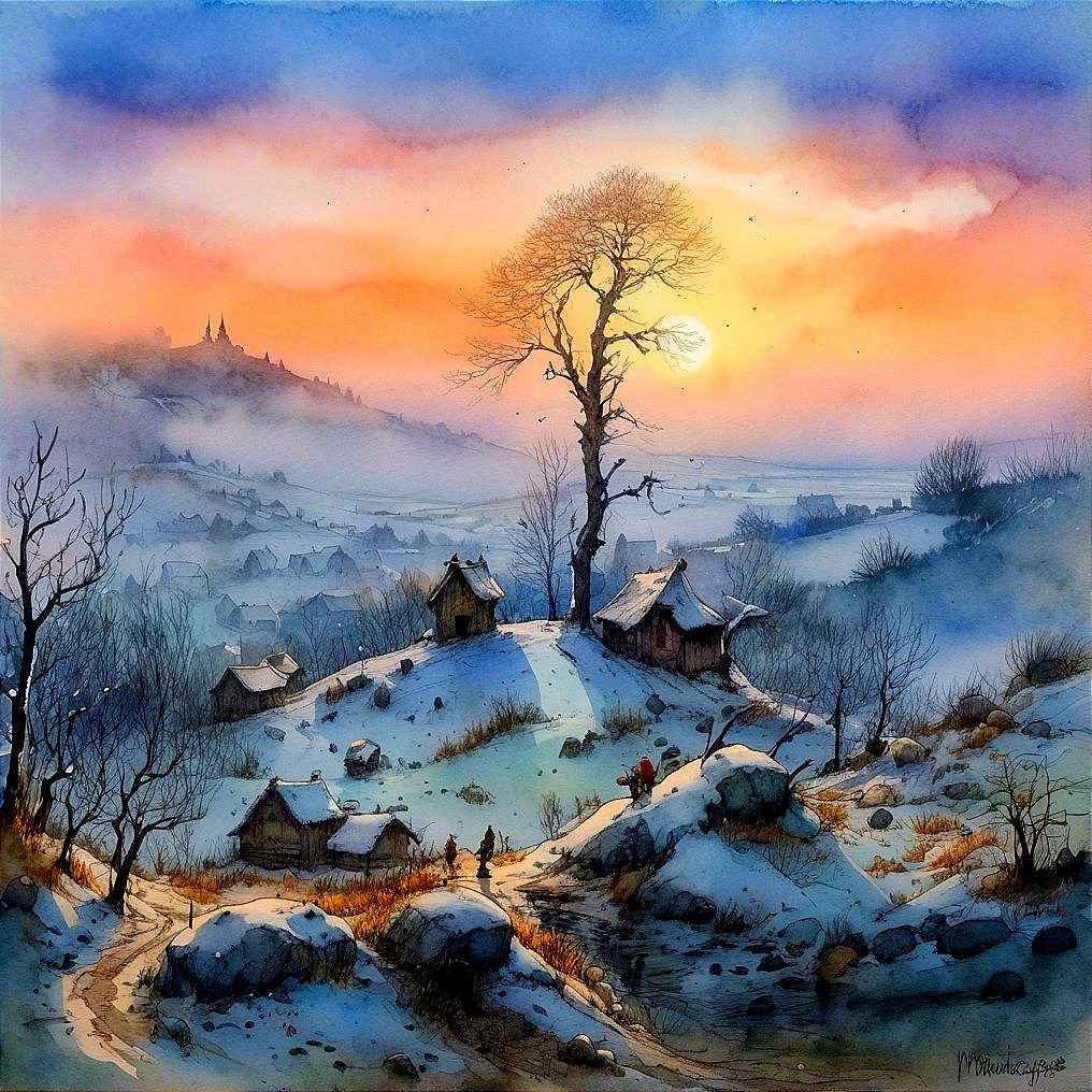 A serene winter landscape at sunset features quaint cottages on a snowy hilltop, silhouetted by a towering tree. Soft hues of orange and blue paint the sky, while distant hills add depth.