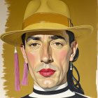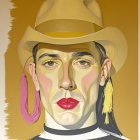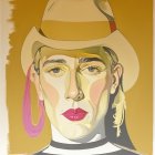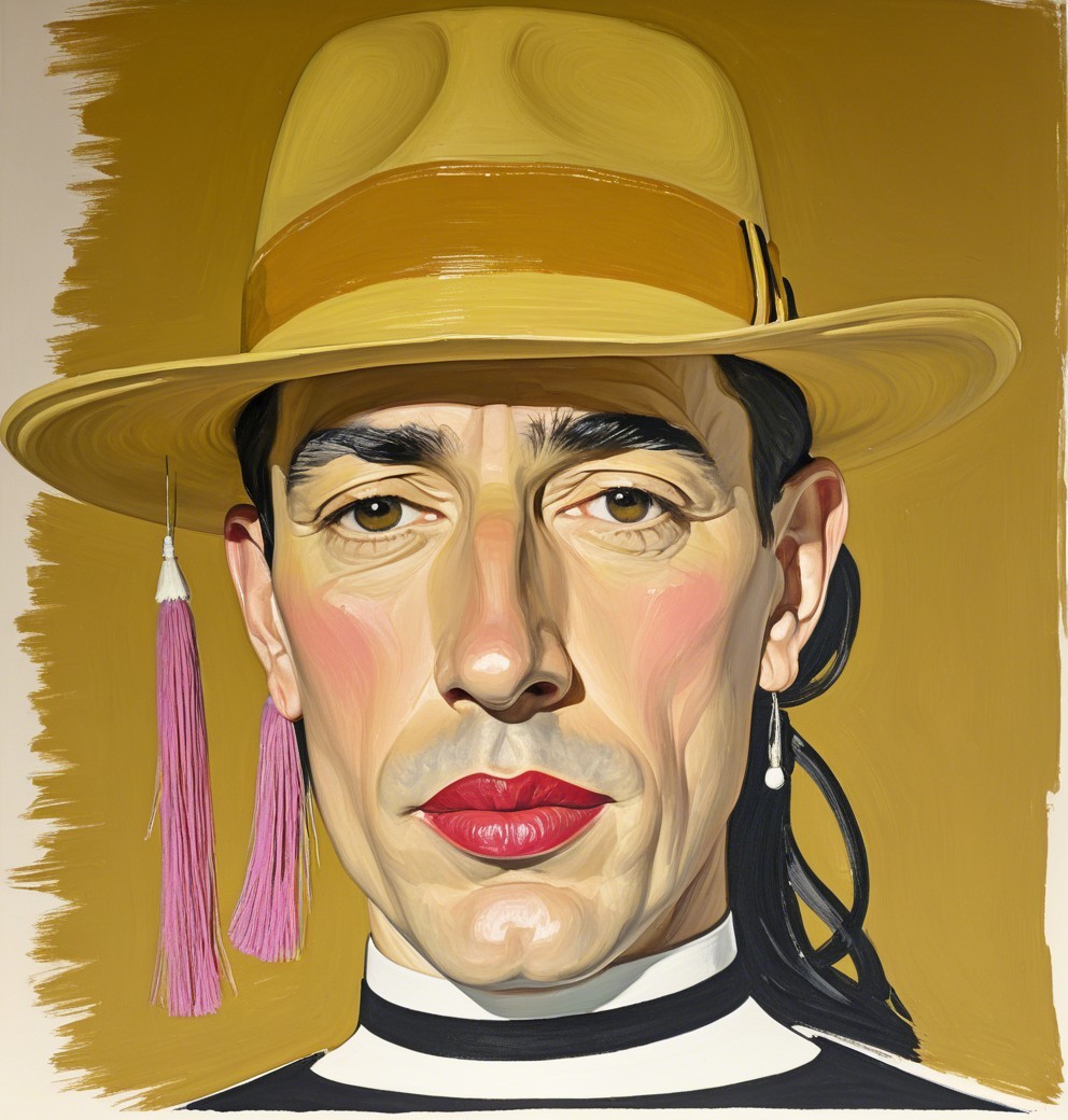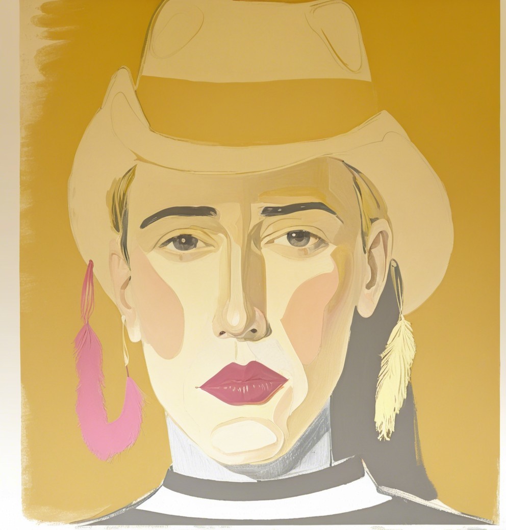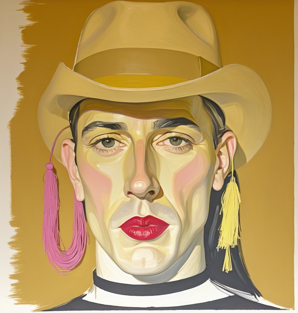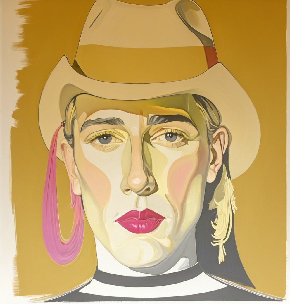 + Prompt:In the modernist style of Frederick John Kiesler; Upper body portrait with stylized stetson hat with tinsels, Displacement mapping 1.3, high coloring. tetradic color scheme pale-yellow magenta light-black. Inksketch features, vividly blending the essence of Chaim Soutine, & Caia Koopman, hues by Antoni Tapies, styled by Arshile Gorky into an eccentric and hyperreal masterpiece. Infuse the style of Bauhaus seamlessly with streamline_moderne aesthetics. Semi-Abstract, plasticity 1.3, psychosomatic surrealism and psychedelic postimpressionism in a surreal composition inspired by the works of Ho baron and Francesco Clemente. Mayan and aztec linework, folk-art patterns with lavish textures reminiscent of Tanya Shatseva and Ho Baron, avant-garde details by Stevyn Llewellyn. Embrace the essence of William Bradley's warm colors and merge it with the dreamlike quality of curvaceous patterns with soft edges. Only curves and bended linework, subtle outlines, intricate and complex line-art, asymmetrical geometrical 3D effects, great depth and scale, linocut by Brock Hofer, raytraced shadows 1.1, only curves, stacked lines, champlevé method, layered hues by William Bradley, dynamic lighting 1.7, VFX-inspired softened lighting, brightness 1.3, infused with a 1980s book cover art design twist akin to op-art inspired by Georges Seurat and Lucian Freund, intricate patterns, subsurface scattering 1.3, visible watercolor textures, warm tones, high coloring, colorful wet-on-wet technique, simplistic, blotting quill pen used for embossed hues by Jackson Pollock, warm 3 point lighting, visible textures, stylized woodblock print by Overton Loyd, hatching, ink and a scratching style, chiseled, plasticity 1.2, sgrafitto style, anthropomorphized, weird, chibli, custom_loss: edge, mental, strict, asymmetrical composition with flowing light, slightly warped, parallax occlusion, foreground with a phong shading of 1.4, abstract brushstroke art, asymmetrical elements, warm coloring, retro-futurism and touch of american gothic, emphasizing shadows and highlights, tousled, delicate tones in a indiecore style,