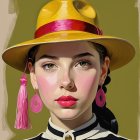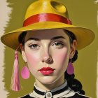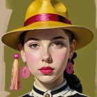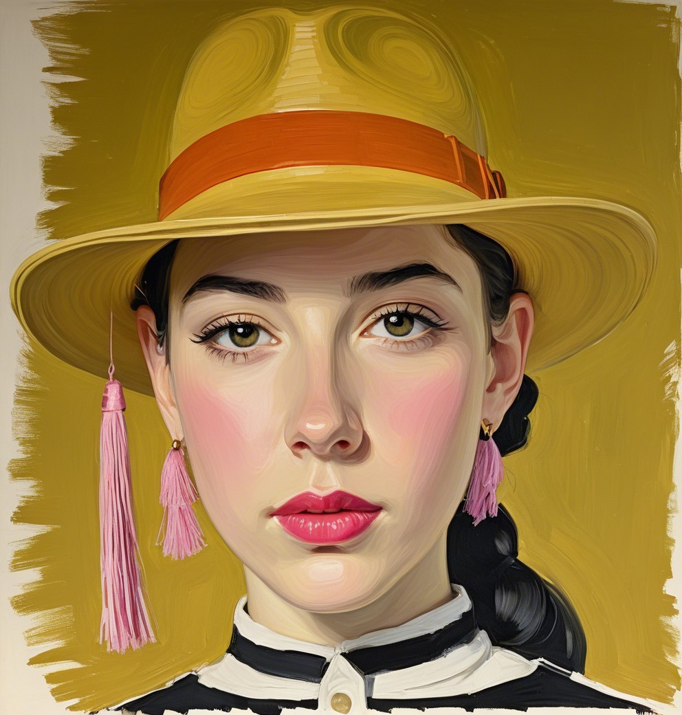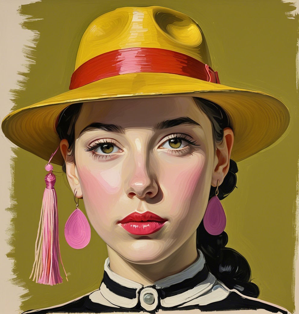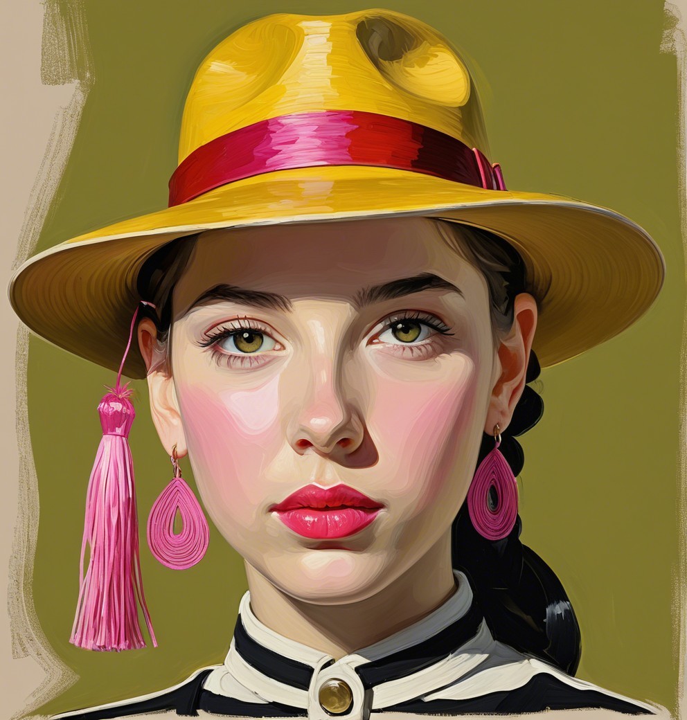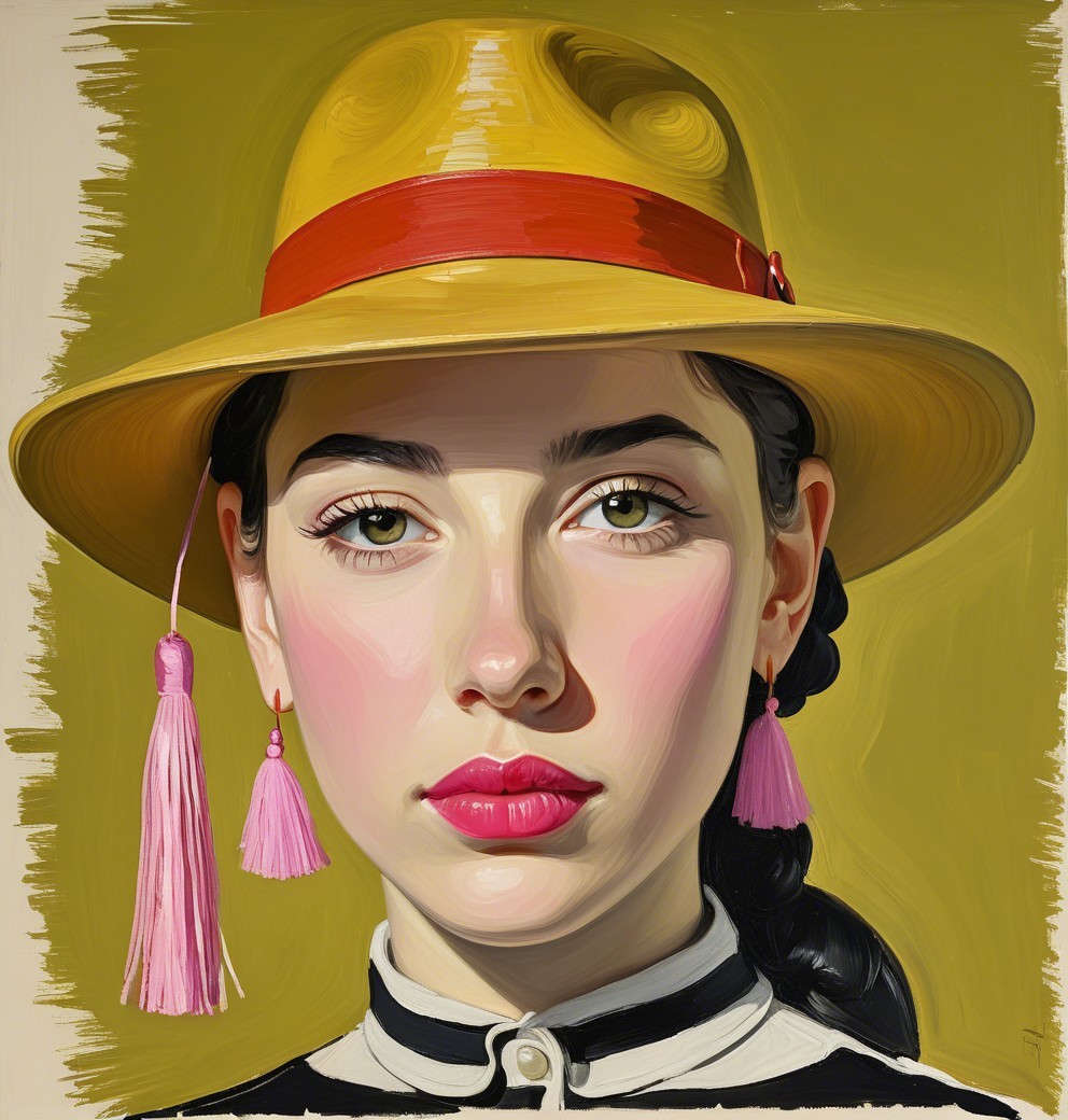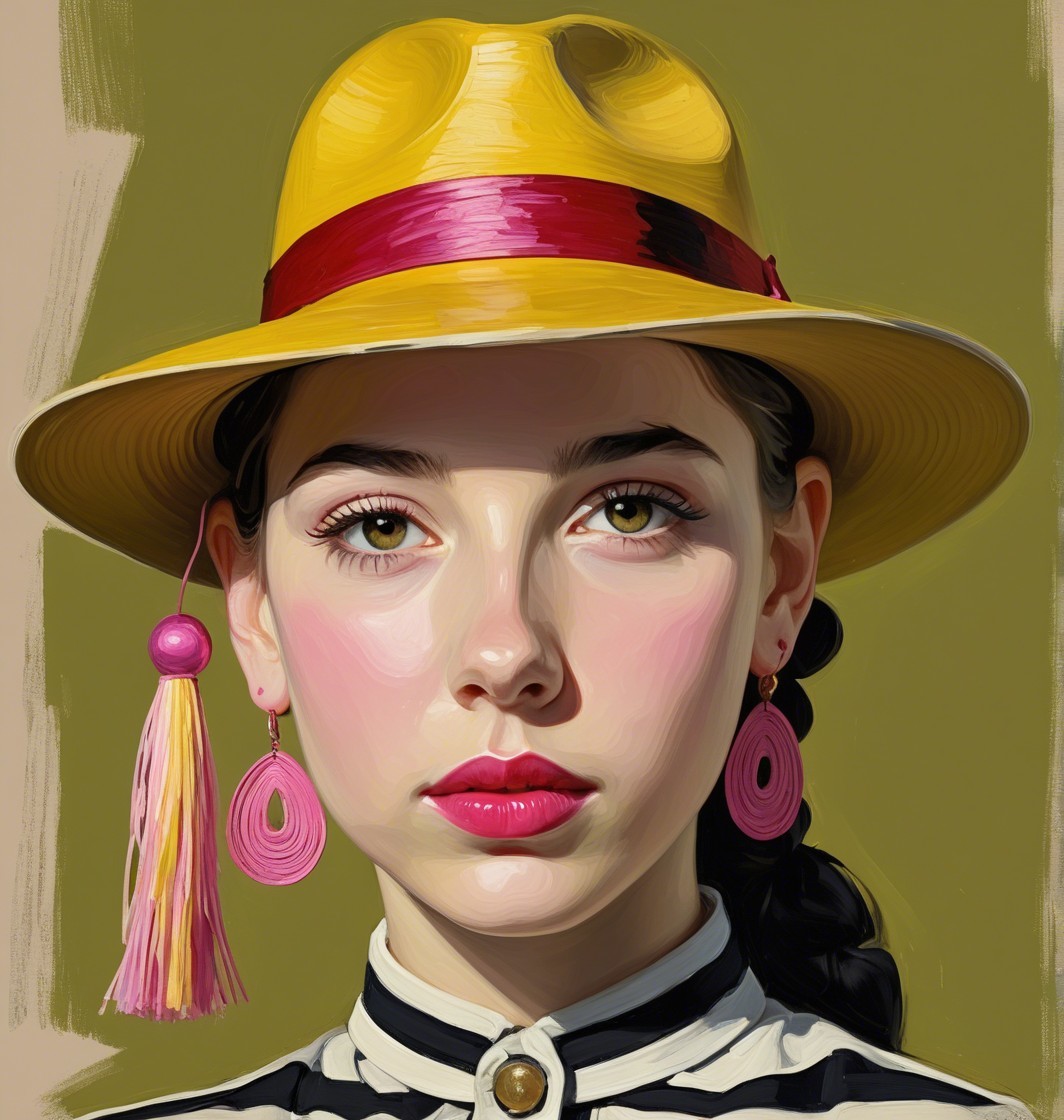 Prompt: In the modernist style of Frederick John Kiesler: portrait of a juvenile female with stylized stetson hat with tinsels, Displacement mapping 1.3, high coloring. Tendril perversion, tetradic color scheme pale-yellow magenta light-black. Inksketch features, vividly blending the essence of Chaim Soutine, & Caia Koopman, hues by Antoni Tapies, unfinished, styled by Arshile Gorky into an eccentric and hyperreal masterpiece. Merge style of Bauhaus seamlessly with streamline_moderne aesthetics. Semi-Abstract, plasticity 1.3, exaggerated multi-layered eyes and nose, hairstreaks akin to tendrils, featuring outlines that intricately define a Gothic maiden with an eerie twist, reminiscent of woodcut-inspired graphics, showcases surreal fissured hues in a plique-à-jour technique, stylized, dynamic lighting effects, subsurface scattering 1.9, dyed, parallax occlusion 1.3, background with fractal effects, splash ink technique in style of Marc Allante, colorful yam, triadic color scheme light-black dark-blue light-grey, line-art, ((warm coloring, (light-auburn, dark-grey, light-beige), classicism reminiscence, contoured patchwork in the style of Man Ray, Laurel Burch, Ho Baron, and Turner). Stippled, blotted, cel-shaded, visible textures. Stylized portrait in mystical scene, 3 point lighting, brightness 1.3, zentangle, plasticity 1.1, with a focus on intricate lines and subtle shading, strong emphasis on the subject's expression and the complex details. Warm lighting is soft and diffused, creating a smooth gradient inking from the subject's face to the background. stylized elements, with a touch of deep mystery. hyper-maximalism, line-art, dyed, soft rounded edges, Pencil and Pastels, ink and alcohol, aquatint merged with psychosomatic undertones and a fantastical flair, contoured, line-art, high coloring, linework details by Ho Baron. 3D textures, parallax occlusion 1.4, debeh, bokeh, vfx, stacked lines, plasticity 1.3, precise gelsculpt 64k, 3d effects, uhd, hdr, vfx-inspired, hues by Man Ray, micro-pen psychosomatic surrealism and psychedelic postimpressionism in a surreal composition inspired by the works of Ho baron and Francesco Clemente. Brushed linework, avant-garde details by Stevyn Llewellyn. Embrace the essence of William Bradley's warm colors, intricate sgraffito by Niko Pirosmani and Mikhail Vrubel, watercolor on textured homemade paper, chubby, plump, pudgy, podgy, lumpy, debeh, bokeh, mip mapping, phong shading. Emphasize the fusion of fantastical coloring and asymmetrical aspects of the design. Overall composition by Richard Serra and Ho Baron, touch of american gothic, emphasizing shadows and highlights, tousled, delicate tones in a indiecore style, slightly exaggerated features, intricate pen and ink details, dramatic lighting casting raytraced shadows, Adam Martinakis-inspired style, Che Lin Thomas and Ethan Lord influences, dynamic lighting contrasts, ethereal atmosphere, intricate linework, dark and mysterious ambiance, digital medium, high resolution, monochromatic color scheme with hints of deep shadows and highlights.