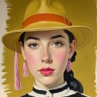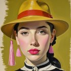In the modernist style of Frederick John Kiesler: portrait of a juvenile female with stylized stetson hat with tinsels, Displacement mapping 1.3, high coloring. Tendril perversion, tetradic color scheme pale-yellow magenta light-black. Inksketch features, vividly blending the essence of Chaim Soutine, & Caia Koopman, hues by Antoni Tapies, unfinished, styled by Arshile Gorky into an eccentric and hyperreal masterpiece. Merge style of Bauhaus seamlessly with streamline_moderne aesthetics. Semi-Abstract, plasticity 1.3, exaggerated multi-layered eyes and nose, hairstreaks akin to tendrils, featuring outlines that intricately define a Gothic maiden with an eerie twist, reminiscent of woodcut-inspired graphics, showcases surreal fissured hues in a plique-à-jour technique, stylized, dynamic lighting effects, subsurface scattering 1.9, dyed, parallax occlusion 1.3, background with fractal effects, splash ink technique in style of Marc Allante, colorful yam, triadic color scheme light-black dark-blue light-grey, line-art, ((warm coloring, (light-auburn, dark-grey, light-beige), classicism reminiscence, contoured patchwork in the style of Man Ray, Laurel Burch, Ho Baron, and Turner). Stippled, blotted, cel-shaded, visible textures. Stylized portrait in mystical scene, 3 point lighting, brightness 1.3, zentangle, plasticity 1.1, with a focus on intricate lines and subtle shading, strong emphasis on the subject's expression and the complex details. Warm lighting is soft and diffused, creating a smooth gradient inking from the subject's face to the background. stylized elements, with a touch of deep mystery. hyper-maximalism, line-art, dyed, soft rounded edges, Pencil and Pastels, ink and alcohol, aquatint merged with psychosomatic undertones and a fantastical flair, contoured, line-art, high coloring, linework details by Ho Baron. 3D textures, parallax occlusion 1.4, debeh, bokeh, vfx, stacked lines, plasticity 1.3, precise gelsculpt 64k, 3d effects, uhd, hdr, vfx-inspired, hues by Man Ray, micro-pen psychosomatic surrealism and psychedelic postimpressionism in a surreal composition inspired by the works of Ho baron and Francesco Clemente. Brushed linework, avant-garde details by Stevyn Llewellyn. Embrace the essence of William Bradley's warm colors, intricate sgraffito by Niko Pirosmani and Mikhail Vrubel, watercolor on textured homemade paper, chubby, plump, pudgy, podgy, lumpy, debeh, bokeh, mip mapping, phong shading. Emphasize the fusion of fantastical coloring and asymmetrical aspects of the design. Overall composition by Richard Serra and Ho Baron, touch of american gothic, emphasizing shadows and highlights, tousled, delicate tones in a indiecore style, slightly exaggerated features, intricate pen and ink details, dramatic lighting casting raytraced shadows, Adam Martinakis-inspired style, Che Lin Thomas and Ethan Lord influences, dynamic lighting contrasts, ethereal atmosphere, intricate linework, dark and mysterious ambiance, digital medium, high resolution, monochromatic color scheme with hints of deep shadows and highlights.