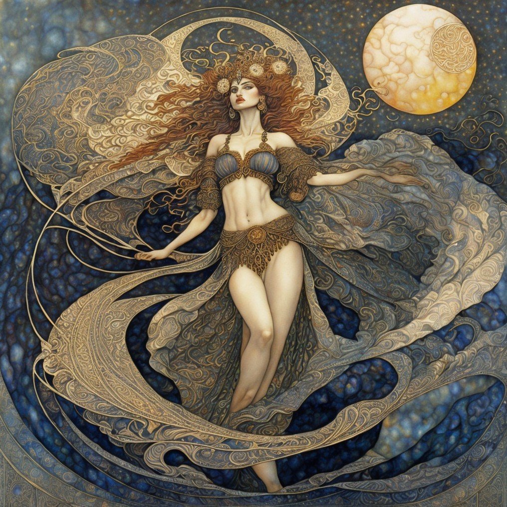 A graceful woman with flowing hair dances under a crescent moon, adorned in an ornate, flowing gown. Her floral crown and intricate patterns create a mystical, enchanting atmosphere.