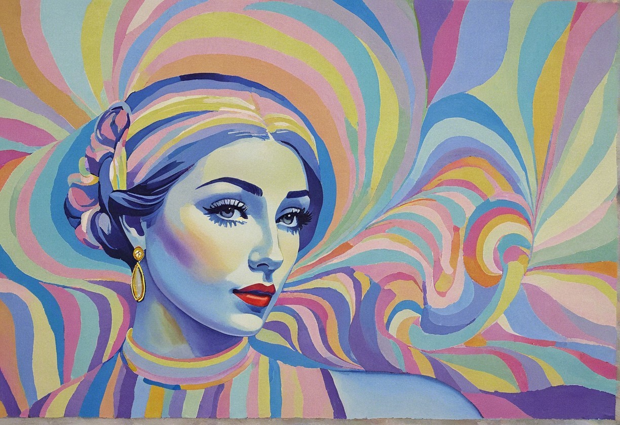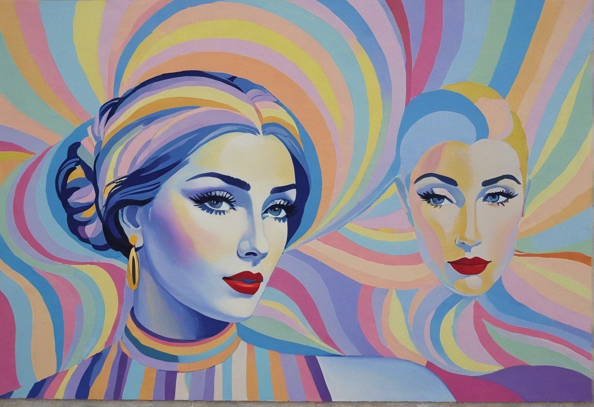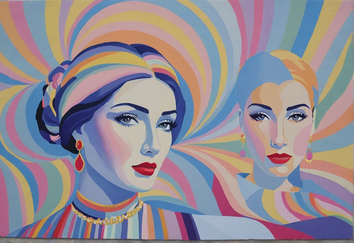 The artwork features two stylish women with vibrant hair and bold makeup against a swirling, colorful background. Their attire and accessories reflect a retro, glamorous aesthetic.