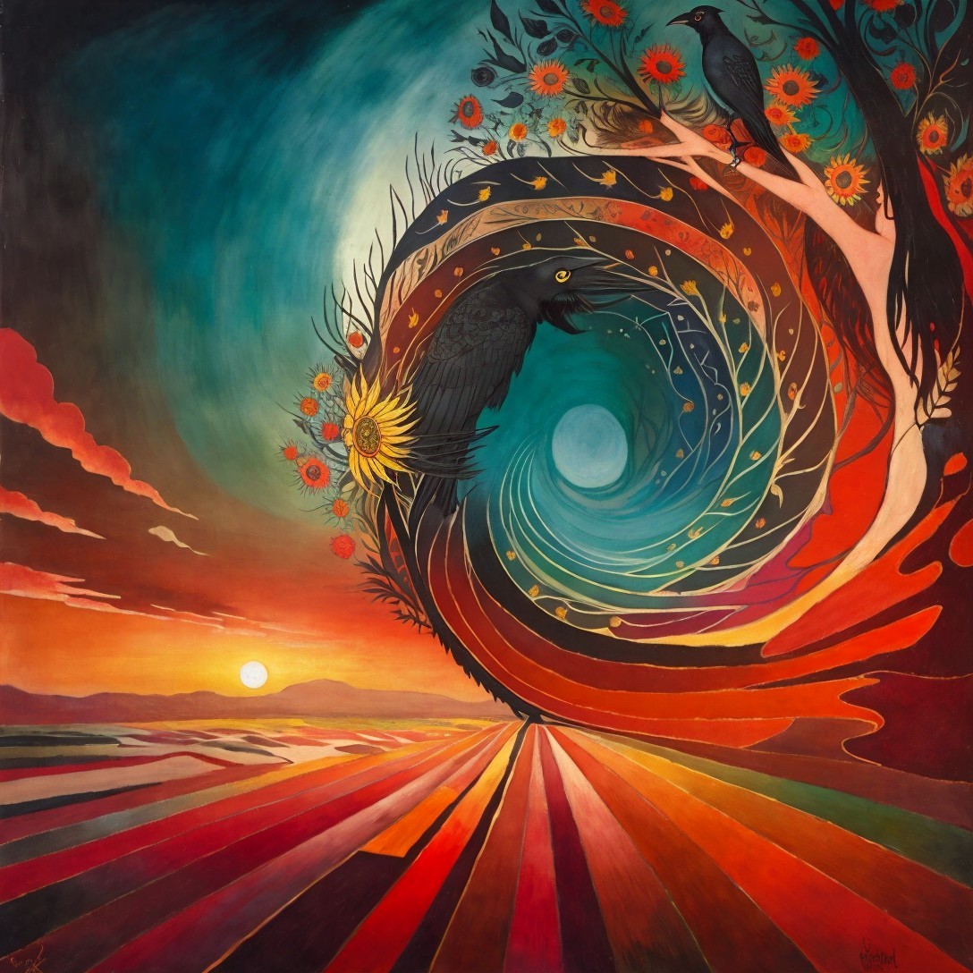 A vibrant painting of a black crow with a sunflower wing perched on a branch, against a backdrop of a large moon, red sky, and flowers.