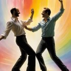 Two joyful men dance playfully against a vibrant, swirling rainbow backdrop. Their lively movement and bright clothing complement the colorful, dreamy atmosphere.
