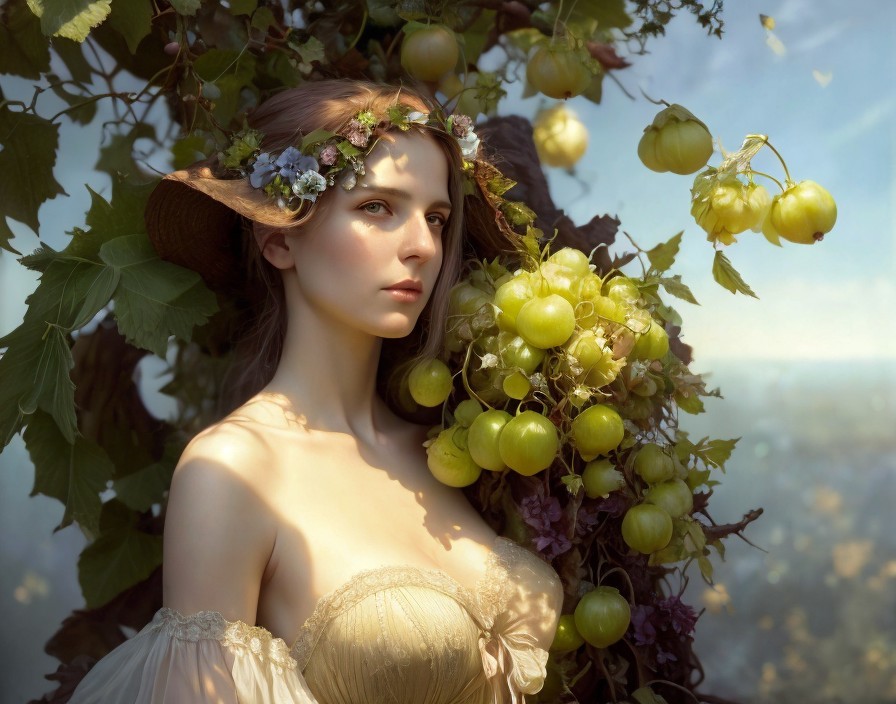 Prompt: "the vine with gooseberries, soft diffused light fantasy Jean-Baptiste Monge, Boris Vallejo Keith Parkinson Karol Bak anatomically correct spectacular, in the style of Leonora Carrington, René Magritte, Hieronymus Bosch, 4K 3D crisp quality dramatic Magic Realism Gothic ghostly decadence dramatic lighting and shadows Ultra-detailed diorama Double Exposure Effect Searching for non-obvious connections"