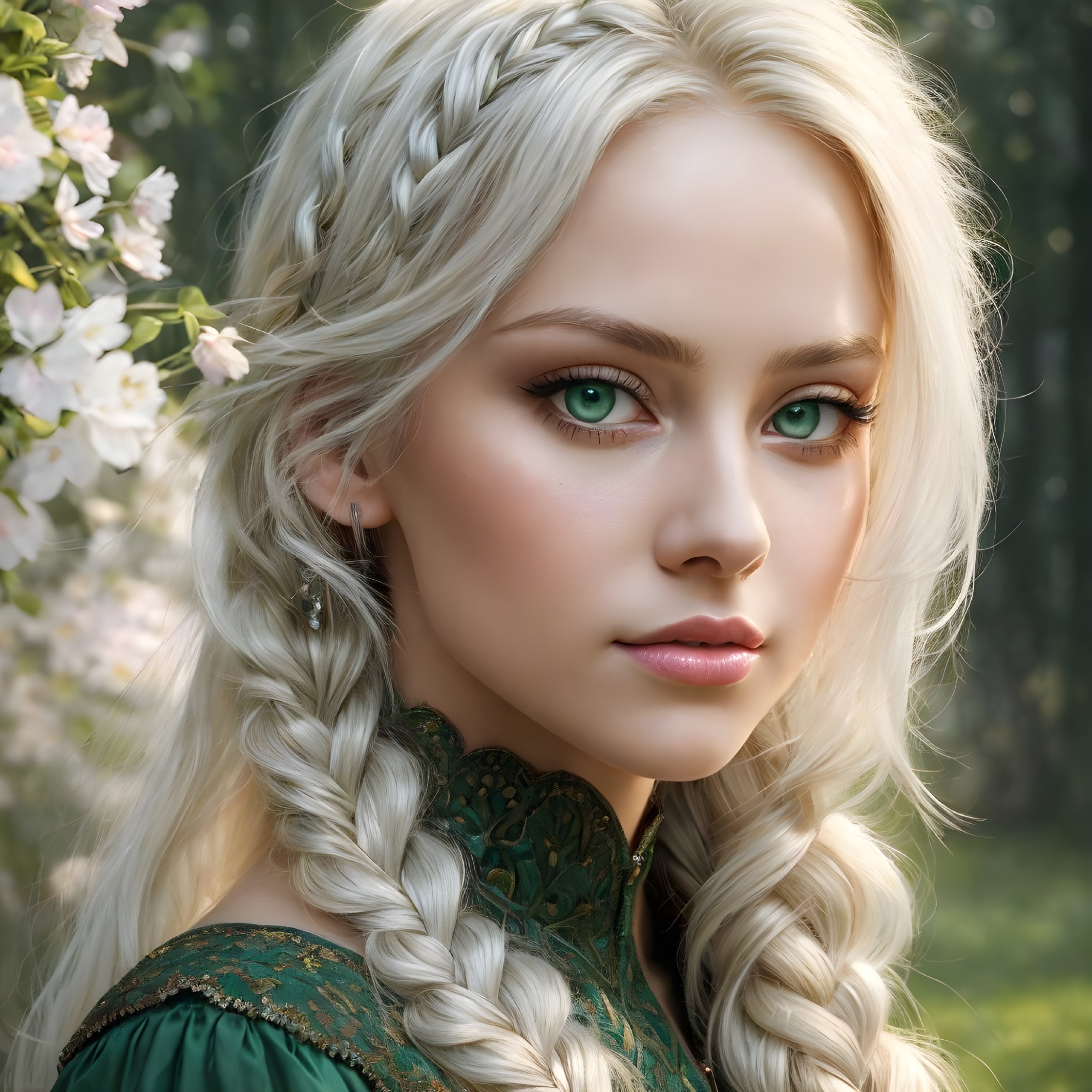 A young woman with long, braided silver-blonde hair and striking green eyes gazes softly at the viewer. She wears a deep green dress, surrounded by blooming flowers in a serene forest setting.