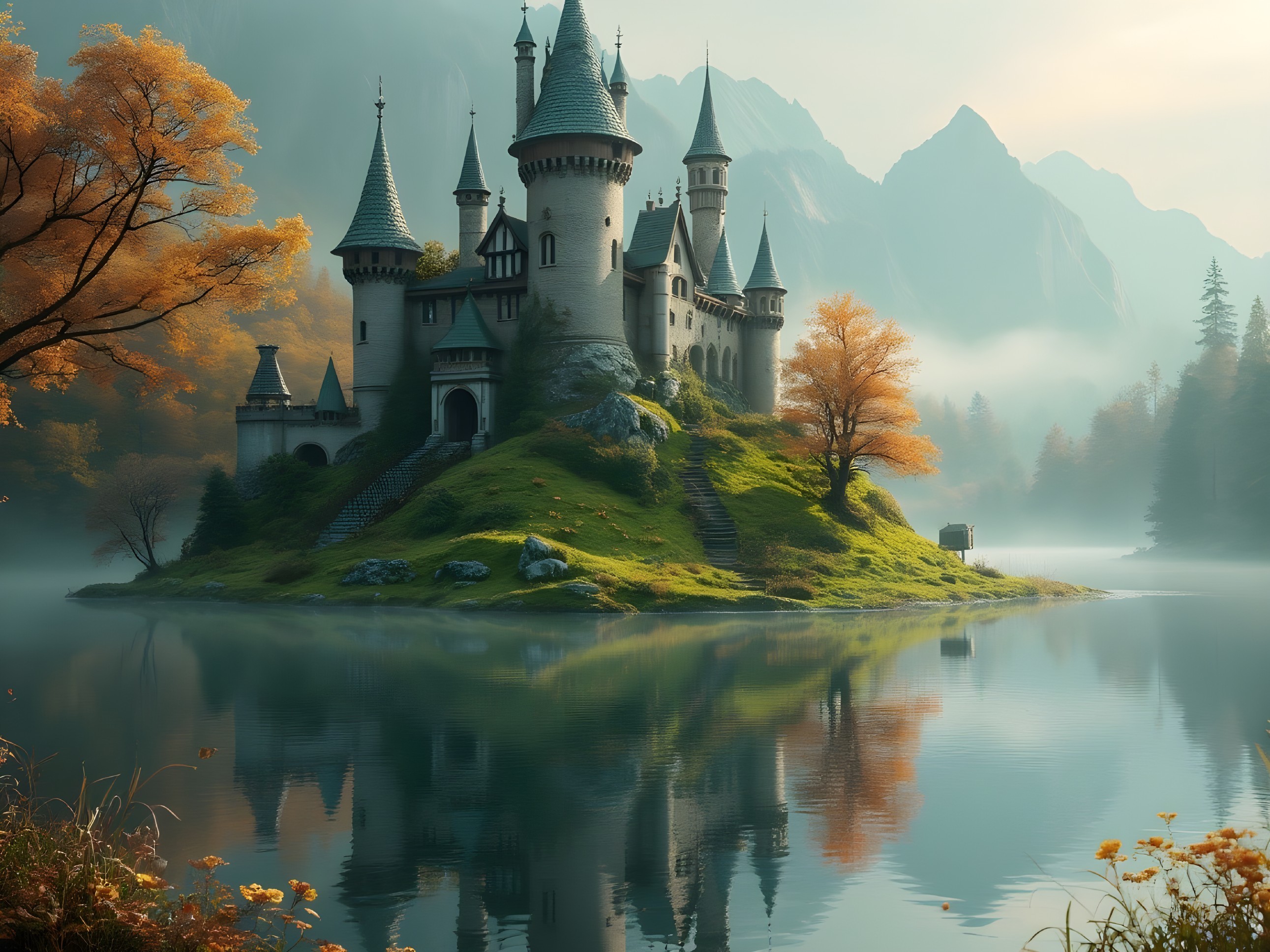A serene castle sits on an island, surrounded by misty waters and autumn trees. Majestic mountains rise in the background, creating a magical and tranquil atmosphere.