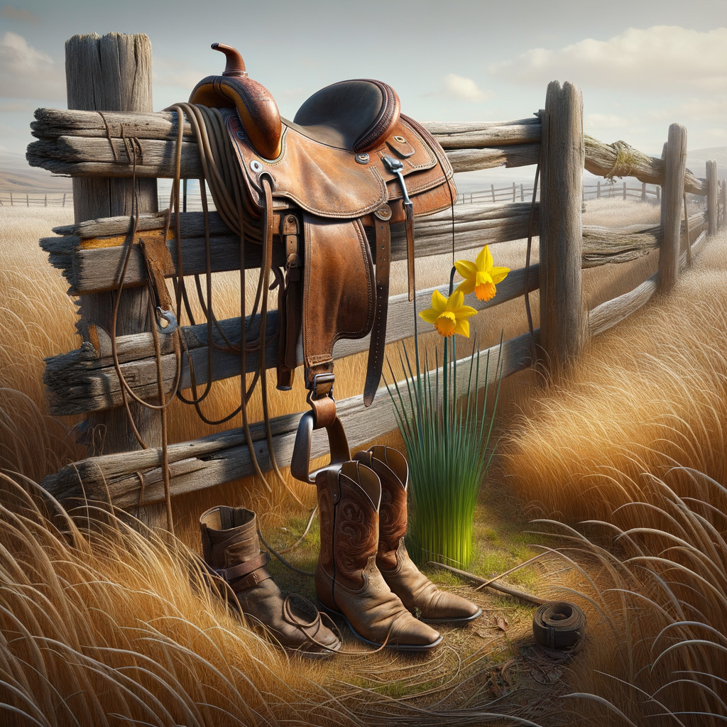 Western saddle on a fence, cowboy boots, and a hat on the grass, with a daffodil in bloom, suggesting a rural, equestrian setting.