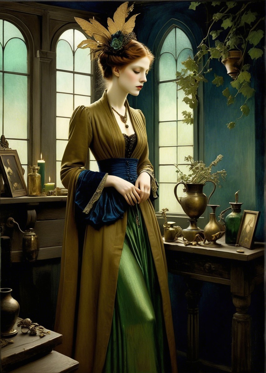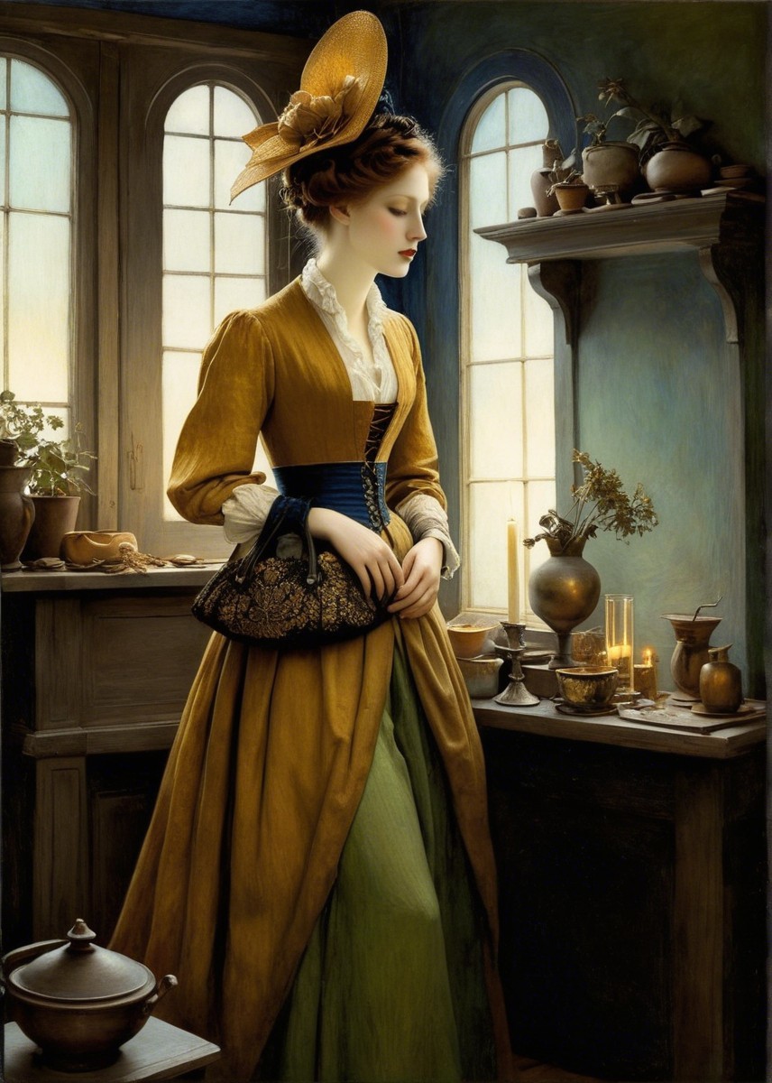 A woman in a rich, colorful gown stands by a window, gazing thoughtfully. A soft glow from a lantern and a starry night sky create a serene, enchanting atmosphere.