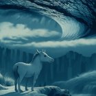 Prompt: A mystical scene showcasing a unicorn standing on a rocky cliff, gazing into the distance. The landscape is illuminated in shades of blue, with dramatic, swirling clouds above that suggest an impending storm. In the background, rugged cliffs rise steeply, shrouded in mist. The atmosphere is serene yet charged with anticipation, as the unicorn exudes an aura of calm determination amidst the wild, turbulent sky.