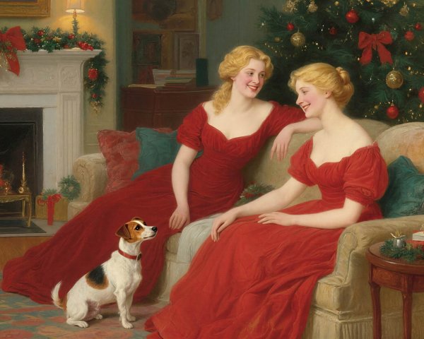 A woman in a luxurious period gown poses in an opulent room with antique furniture and a small dog by her side.