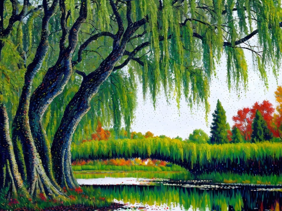 A vibrant landscape features weeping willow trees with lush green foliage, a serene pond reflecting bright autumn colors, and a charming bridge adorned with colorful flowers and lush grass.