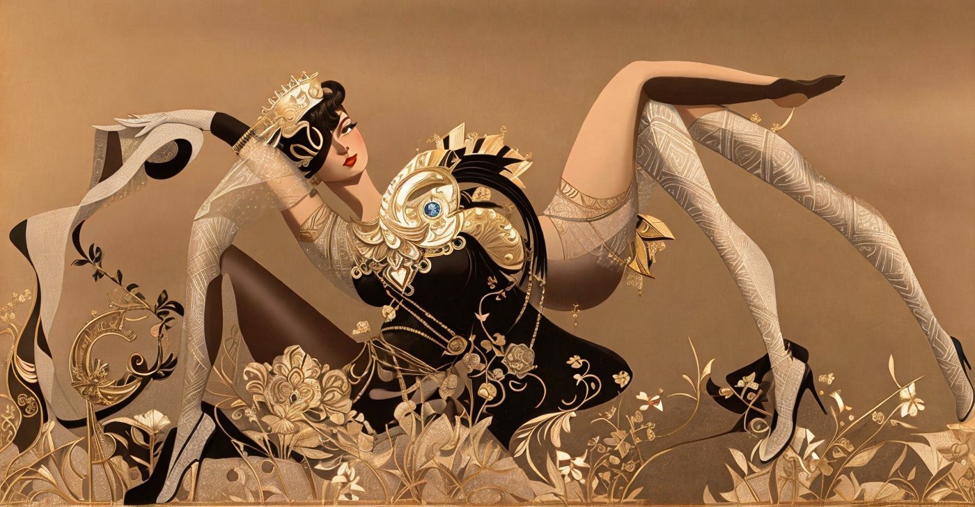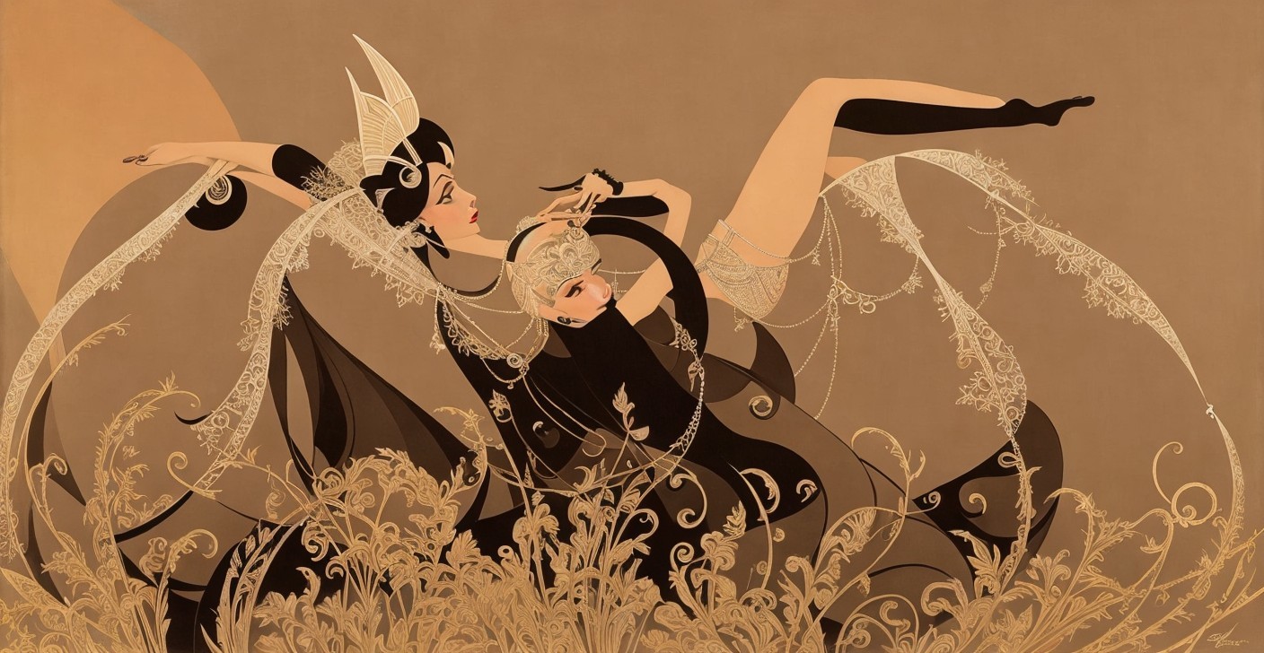 Elegant Composition of Four Dressed Women in Fantasy Setting