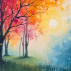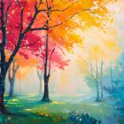 A serene landscape features vibrant orange and red trees amidst a misty atmosphere. A figure in white stands gracefully, capturing the beauty of the colorful autumn scene.
