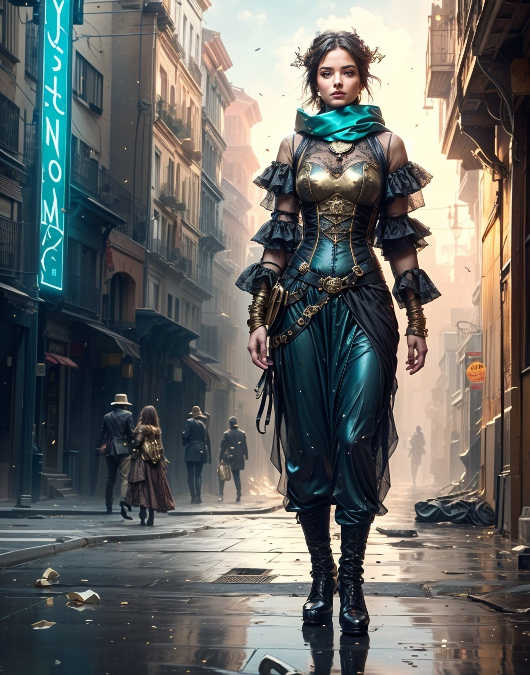 A woman in a Victorian-inspired steampunk outfit stands in a bustling, cobblestone street, with passersby and buildings in the background.