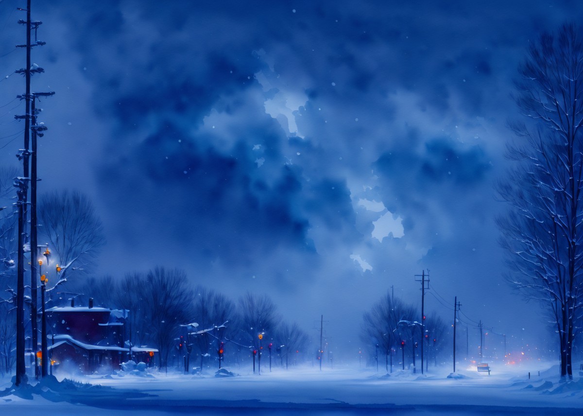 Snow-covered winter night scene with houses, street lamp, and snowflakes