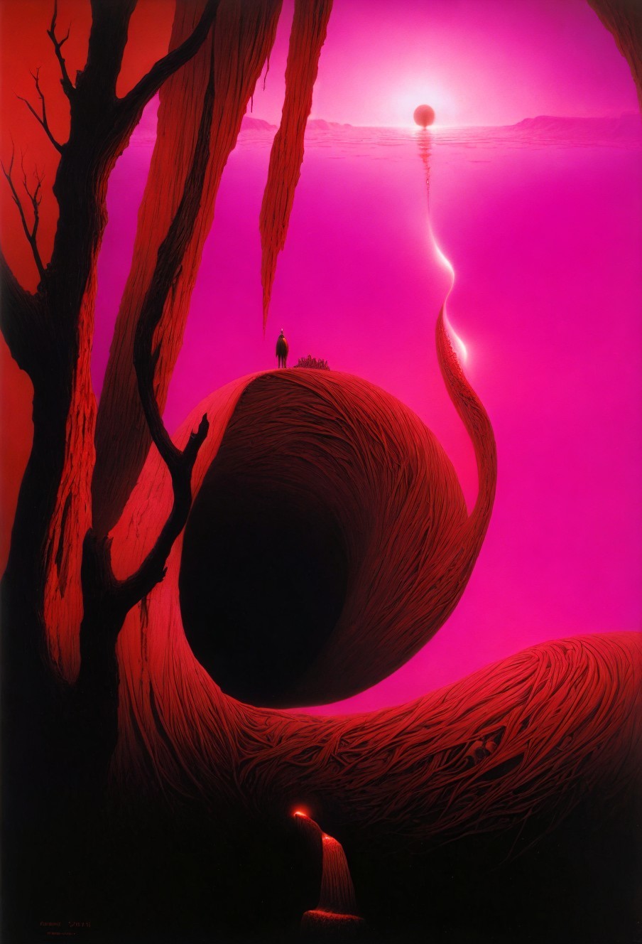 Cloaked Figures on Cliff with Pink Sky and Mist