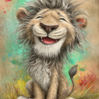 A cute, cartoon-style lion cub sits happily with a big smile. Its fluffy mane and bright eyes radiate joy, surrounded by colorful stars and flowers against a soft, pastel background.