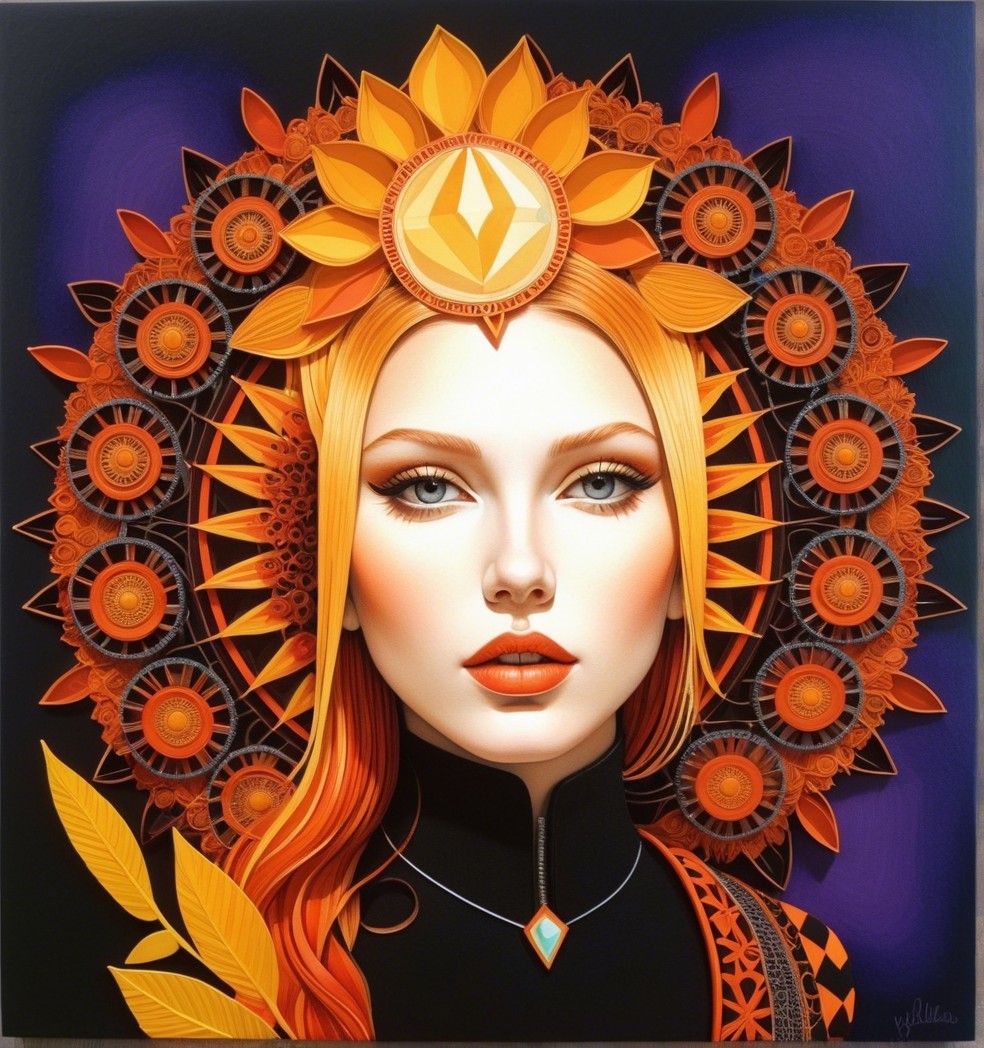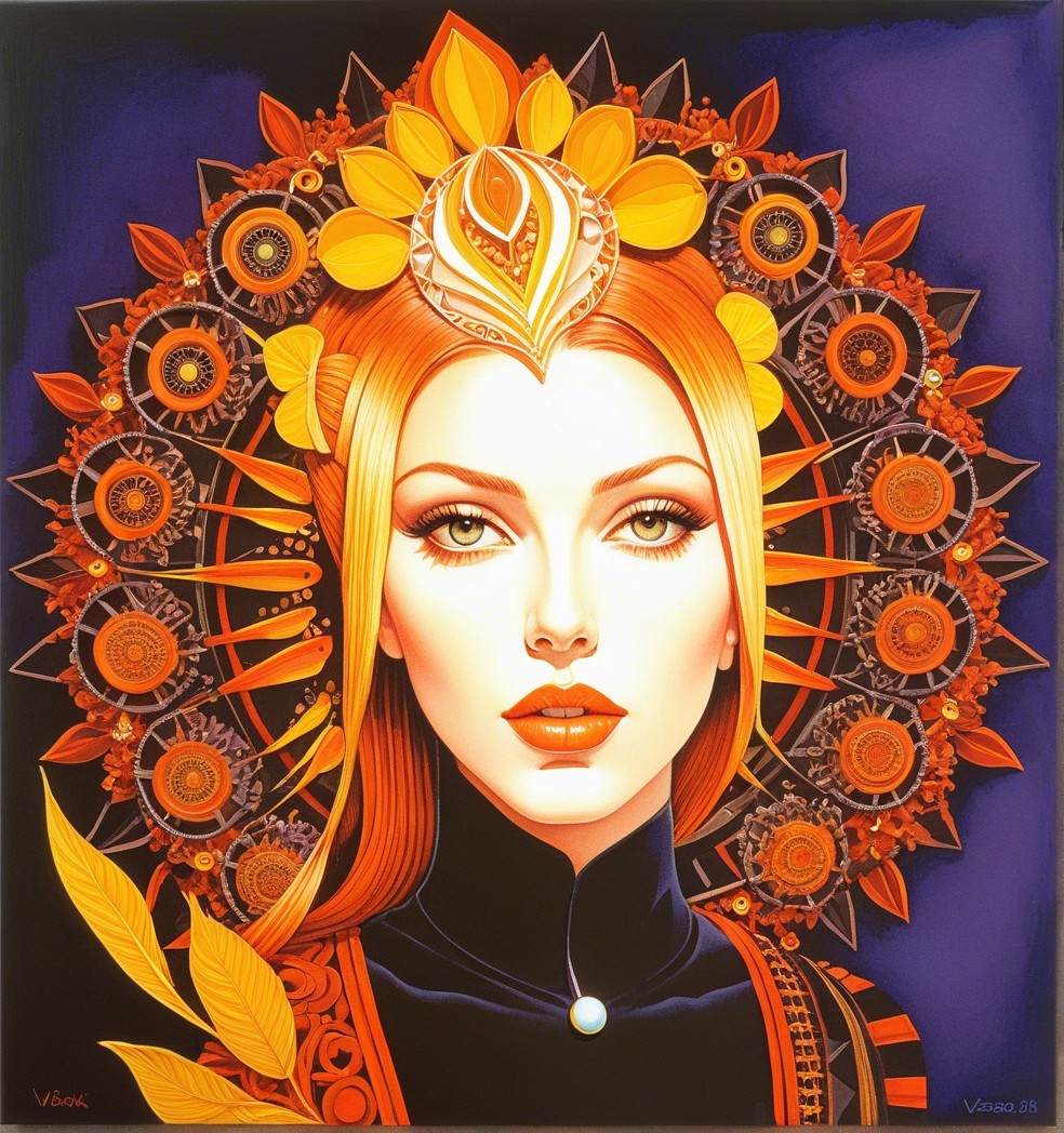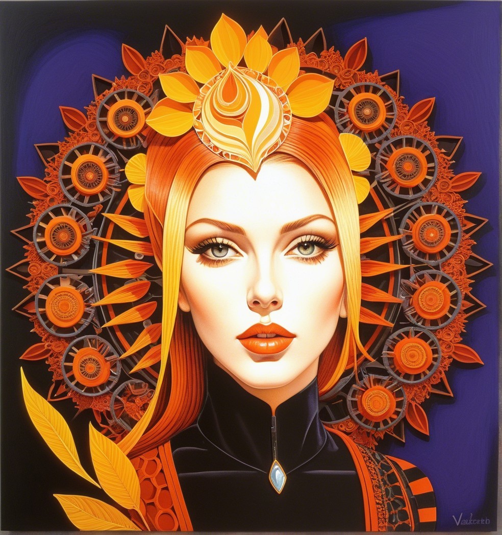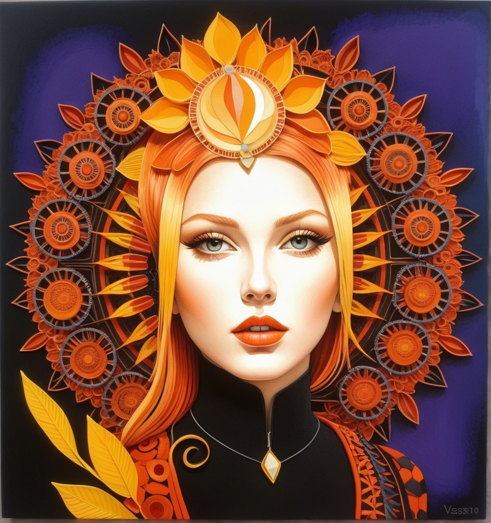 + Prompt:Fantasy art, retropunk, portraiture, mixed media, gouache paint, Zentangle mandalas and orblike patterns, geometrical patterns, hallucinatory intricately detailed line-art, Zentangle art: quilling line art, Magical, cosmical,hues of Victor Vasarely,tints of Frank Frazetta, dark visionary and elaborated Zentangle Style extremely detailed background with cosmic nebula, colourful galaxies, vortex, push processing technique, linocut style of Georgia O'Keeffe, 3d effects, anisotropic filtering 1.7, raytraced shadows 1.8, radiance, divisionism, plasticity 1.3, complexion 1.4, custom_loss:black, embossed strokes, Figurative, synthetic, serene, 1970s advertising art merged with pulp art reminiscent of movie poster art, stylized illustration 1.5