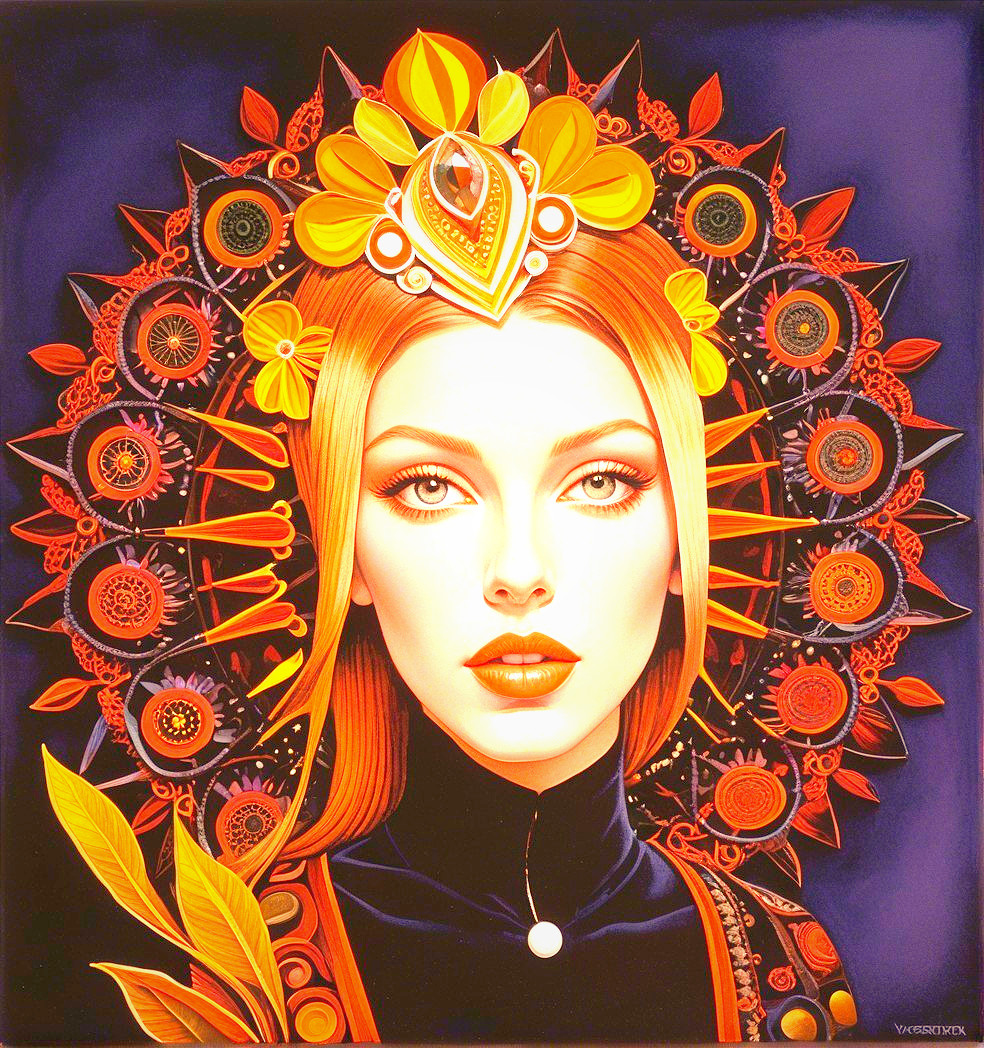 A striking portrait of a woman with long blonde hair, adorned with a crown of sunflowers and intricate patterns, set against a cosmic background of deep blues and purples.