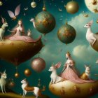 A whimsical, dreamlike scene featuring ethereal figures, elegant unicorns, and ornate celestial spheres amidst a vibrant, cosmic backdrop filled with golden accents and surreal elements.