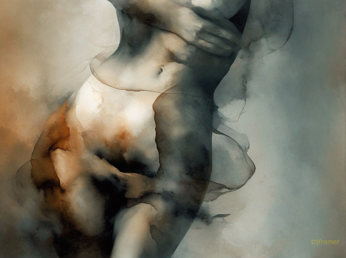 An artistic depiction blending a human figure with smoky, watercolor textures, creating an ethereal and abstract visual effect.