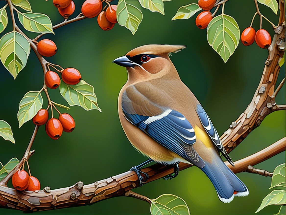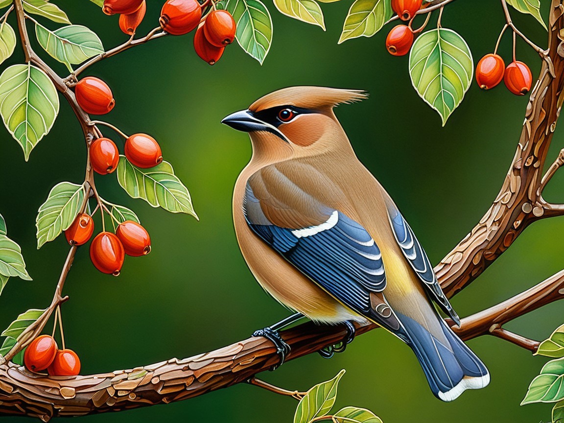 A cedar waxwing with a fluffy crest and colorful plumage perches on a branch adorned with vibrant red berries and lush green leaves, set against a soft, blurred background.