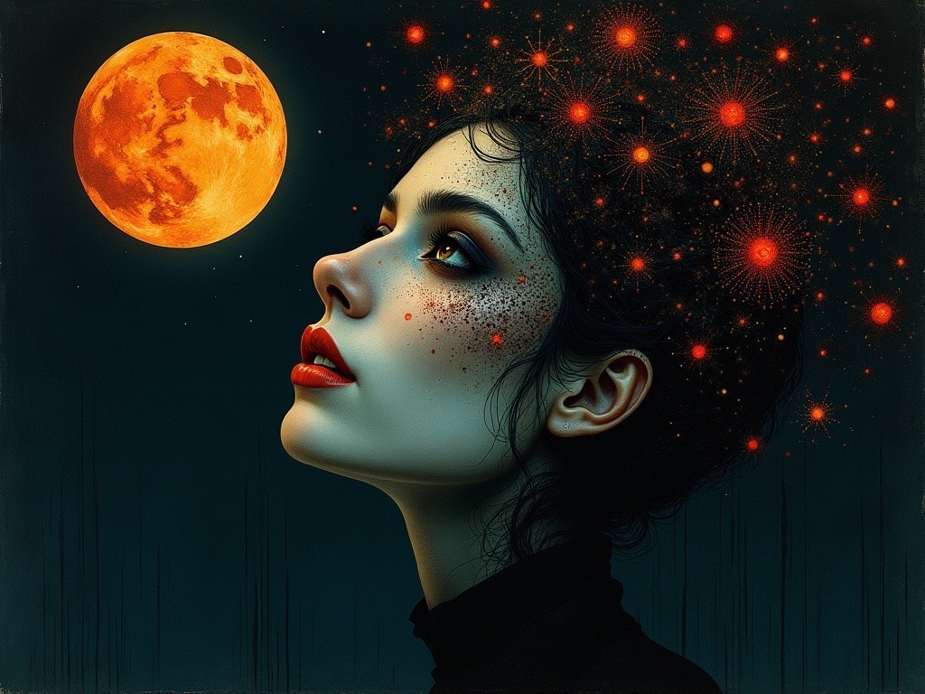 A striking portrait of a young person in profile, with expressive features and short hair. The dark night sky is adorned with a large yellow moon and scattered stars, creating a surreal atmosphere.