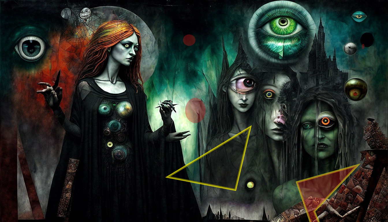 + Prompt:Photorealism, the void of a brain. a simulacrum of Igor Morski work. Eyes. Sci fi surrealism. Dave McKean mixed media. "A Female shaman and the green goddess of the eye, behind broken colored mirrors. Gothic statue. Evil eye levitating. Paul Klee inspired, a mix of photorealistic Marc Chagall art collage and absurdism. metallic paint and newspaper clippings. Modifiers: dof portrait beautiful high detail colourful fine art Marc Chagall Cubism by Paul Klee By Dan Witz Stephen Gammel