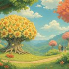 In a vibrant valley, an elderly person and a child walk hand in hand among colorful blooms and majestic trees, framed by lush mountains under a bright, sunny sky.