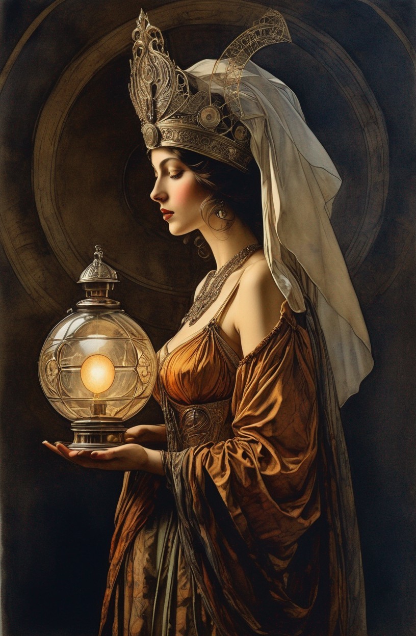 high priestess of magic. colored ink drawing, watercolor artwork on old withered paper, vintage, by Caravaggio, Fragonard, Anton Pieck, pale colors, high detail, intricately detailed, hyperdetailed volumetric lighting, art nouveau graphic steampunk