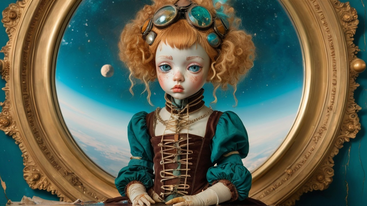 (Try from Veena Katsari) - A whimsical doll with curly orange hair and oversized goggles wears a Victorian-inspired outfit. She sits in front of a cosmic backdrop, framed by an ornate golden mirror.