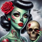Two strikingly styled women stand side by side, showcasing intricate spiderweb and floral tattoos. Their bold makeup features vibrant greens and deep reds against a scenic sunset backdrop.