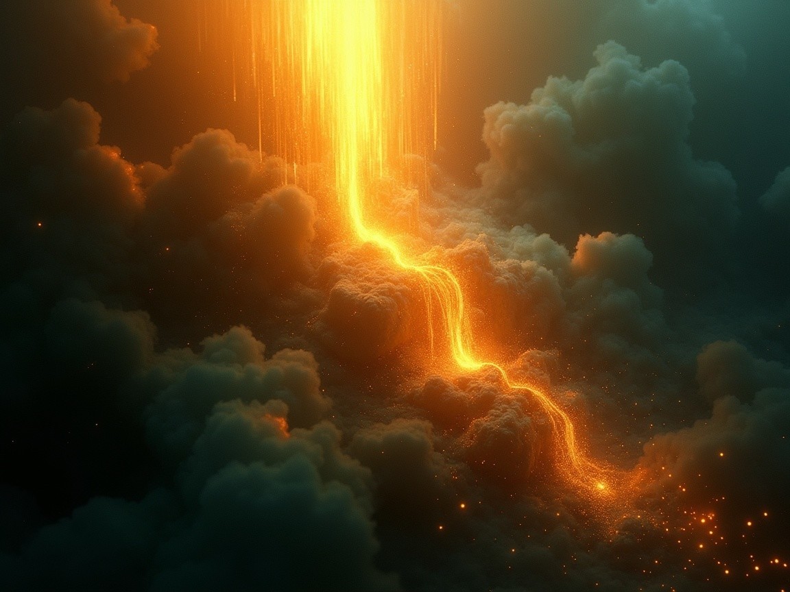 An abstract image showcases vibrant golden and orange light streams cascading from a luminous source, set against a deep, swirling dark background with hints of green and blue. Fluid textures and sparkling particles enhance the cosmic atmosphere, emphasizing the contrast between bright elements and the textured backdrop to create depth and movement.