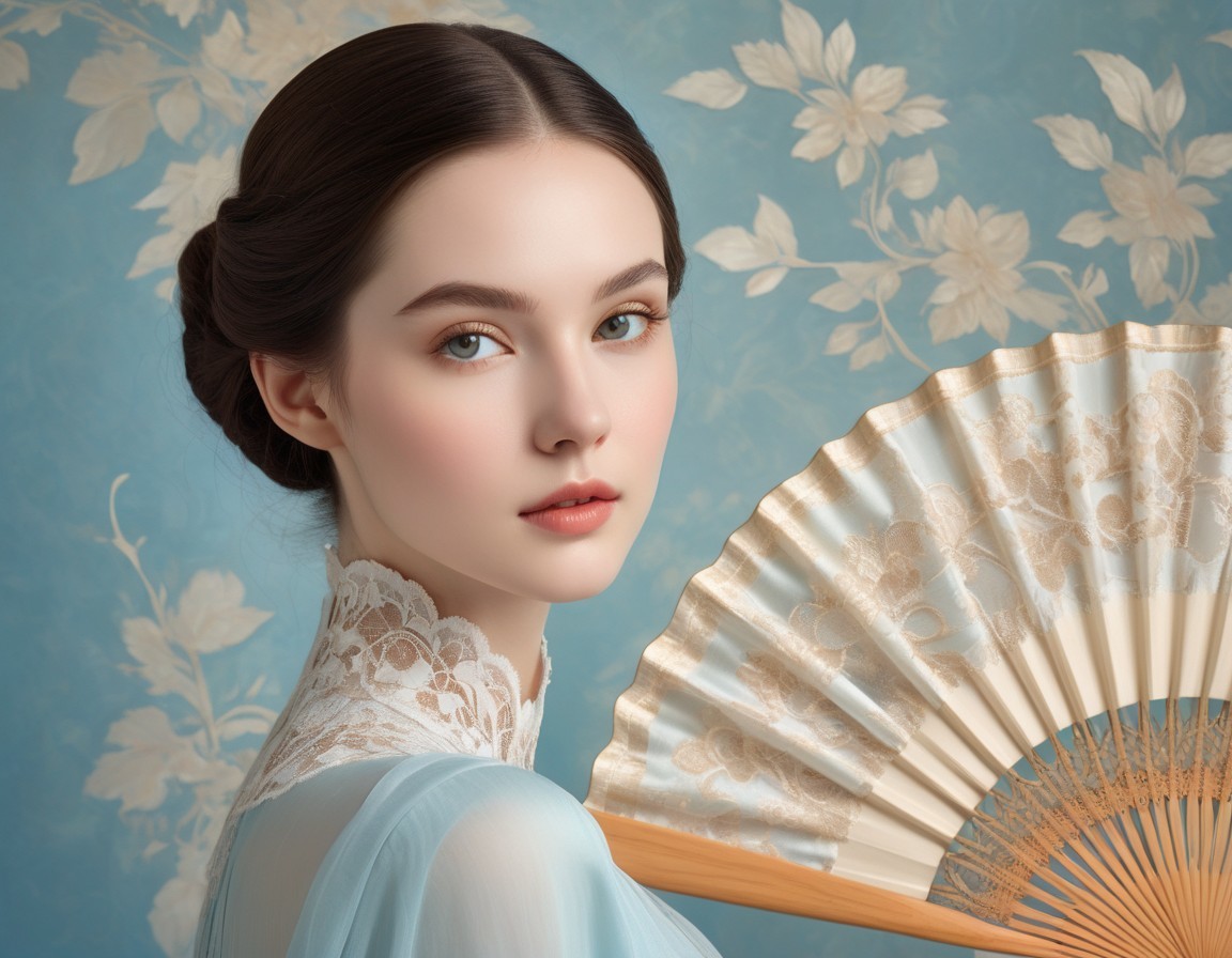 Prompt: "Create a portrait of a female figure with ethereal beauty against a patterned, lacy, cream-colored fan-like background that occupies the upper half of the image. The woman has a pale, flawless complexion and delicate facial features, including high cheekbones, a straight nose, and full lips with a neutral expression. Her large, almond-shaped eyes are a striking light blue, with an intense, serene gaze.