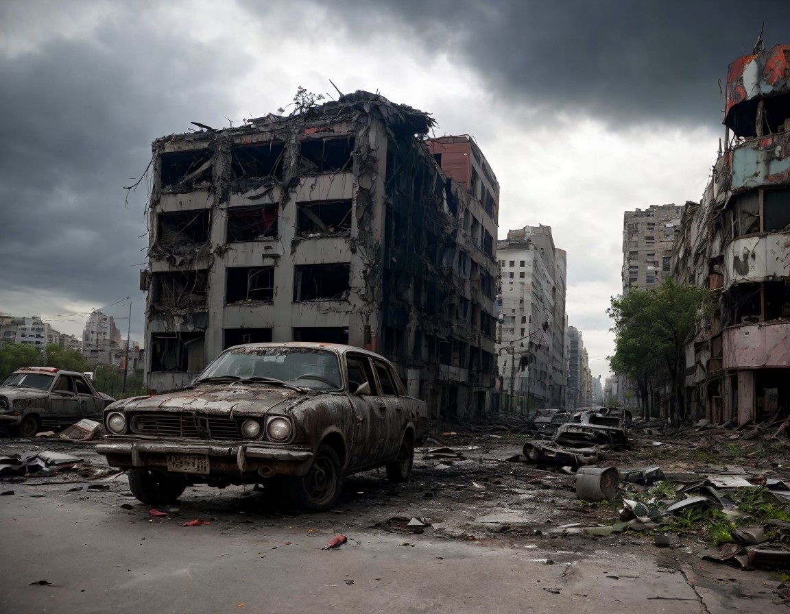 A desolate urban landscape with burnt-out buildings and cars under a stormy sky, depicting devastation or aftermath of a disaster.
