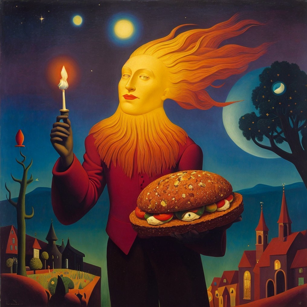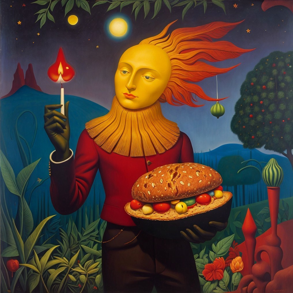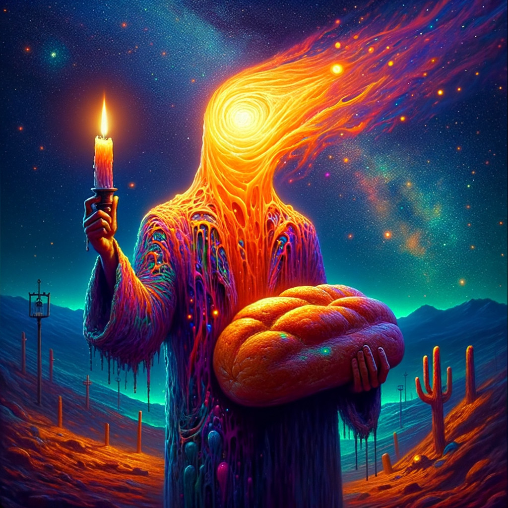Prompt: "Mr. Candlehead with the magical-mystical-psychedelic martian bread, modestly and cautiously, nights spent in poster solitude, surrealist oil painting"