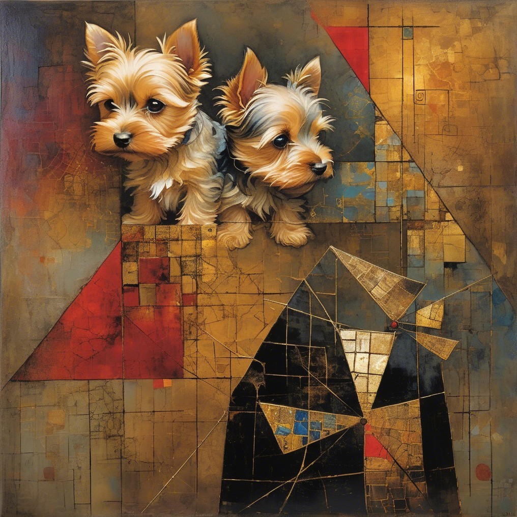 The image features three stylized cats with prominent, golden faces, set against a vibrant background of geometric patterns in red, blue, and gold, blending abstraction with feline charm.