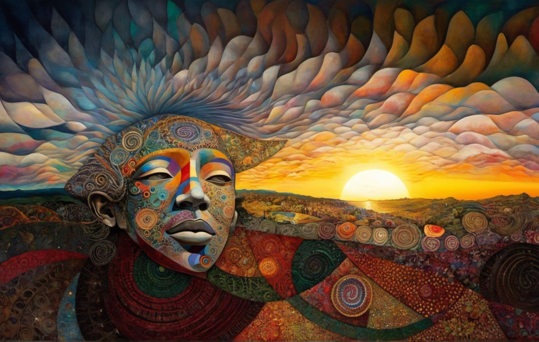 A vibrant painting featuring a stylized, decorated face with a headdress merging into a surreal, colorful landscape with a setting sun.