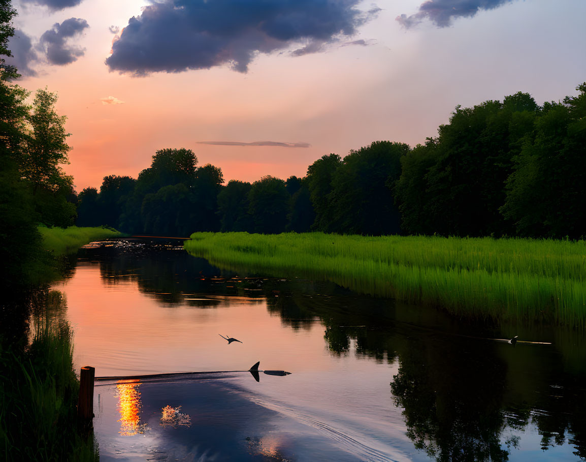 Tranquil river scene at twilight with flying birds and silhouetted trees