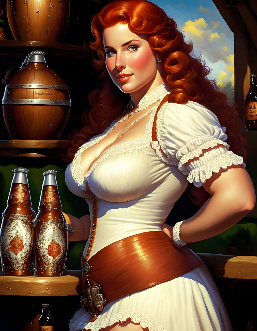 Prompt: beautiful young buxom woman with auburn hair wearing a dirndl at a Bavarian tavern serving beer, German beermaid, German barmaid, full red lips, busty, full large breasts, wide hips, narrow waist, carrying tray of beer steins, Oktoberfest, gorgeous face, beautiful face, by Alex Ross