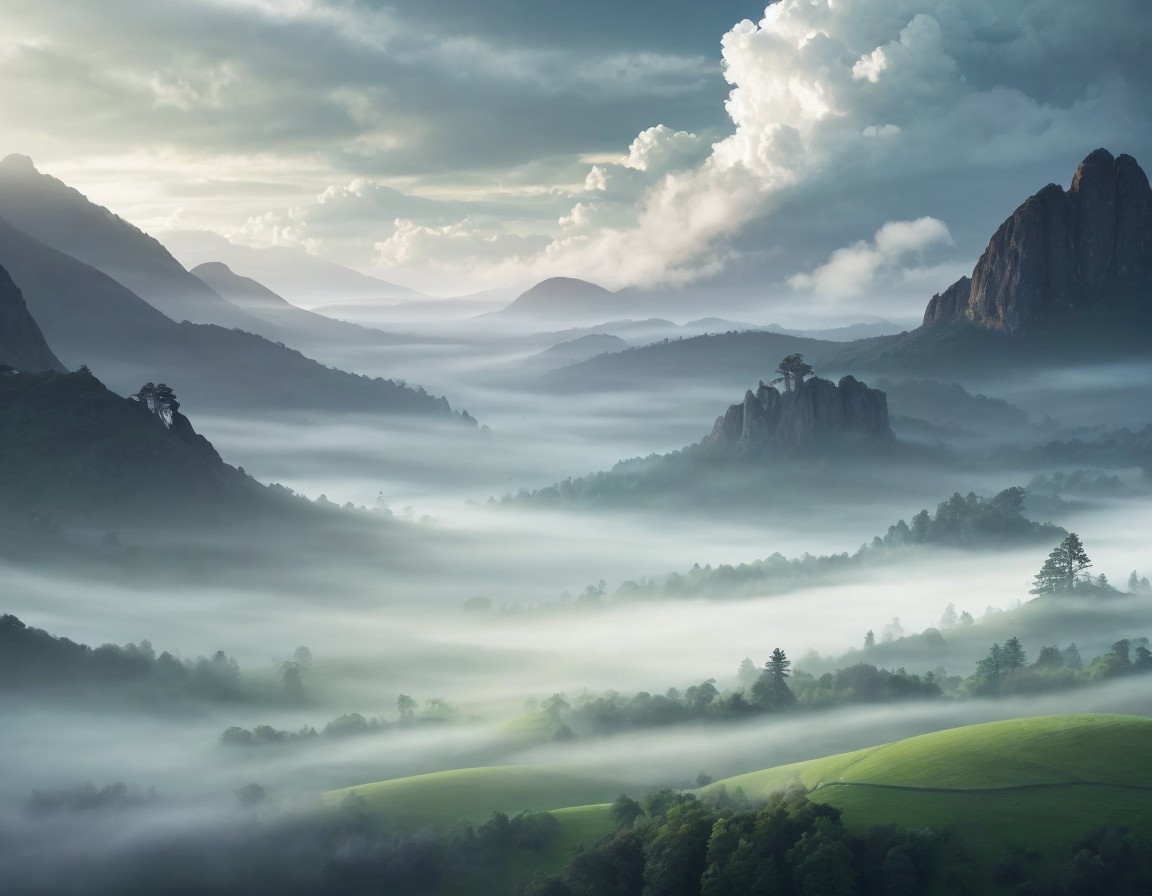 A serene landscape with verdant hills, rocky peaks, and valleys blanketed in mist under a cloudy sky at dawn.