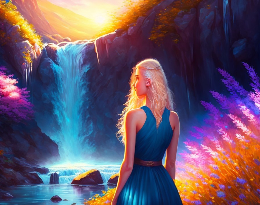 Prompt: "A young woman with blonde hair and blue eyes. She stands at one
