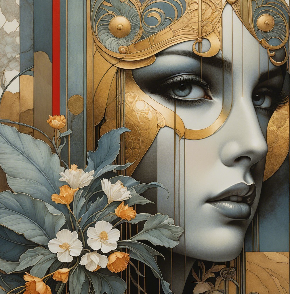 A graceful woman in a flowing gown sits elegantly beside a white bird. The background features intricate golden patterns and soft colors, creating a serene, ethereal atmosphere.
