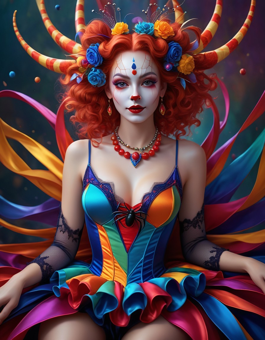 A vibrant woman with curly red hair adorned with colorful flowers and horns wears a striking, multi-colored dress. Her makeup includes bold patterns, adding to the dramatic and artistic vibe.