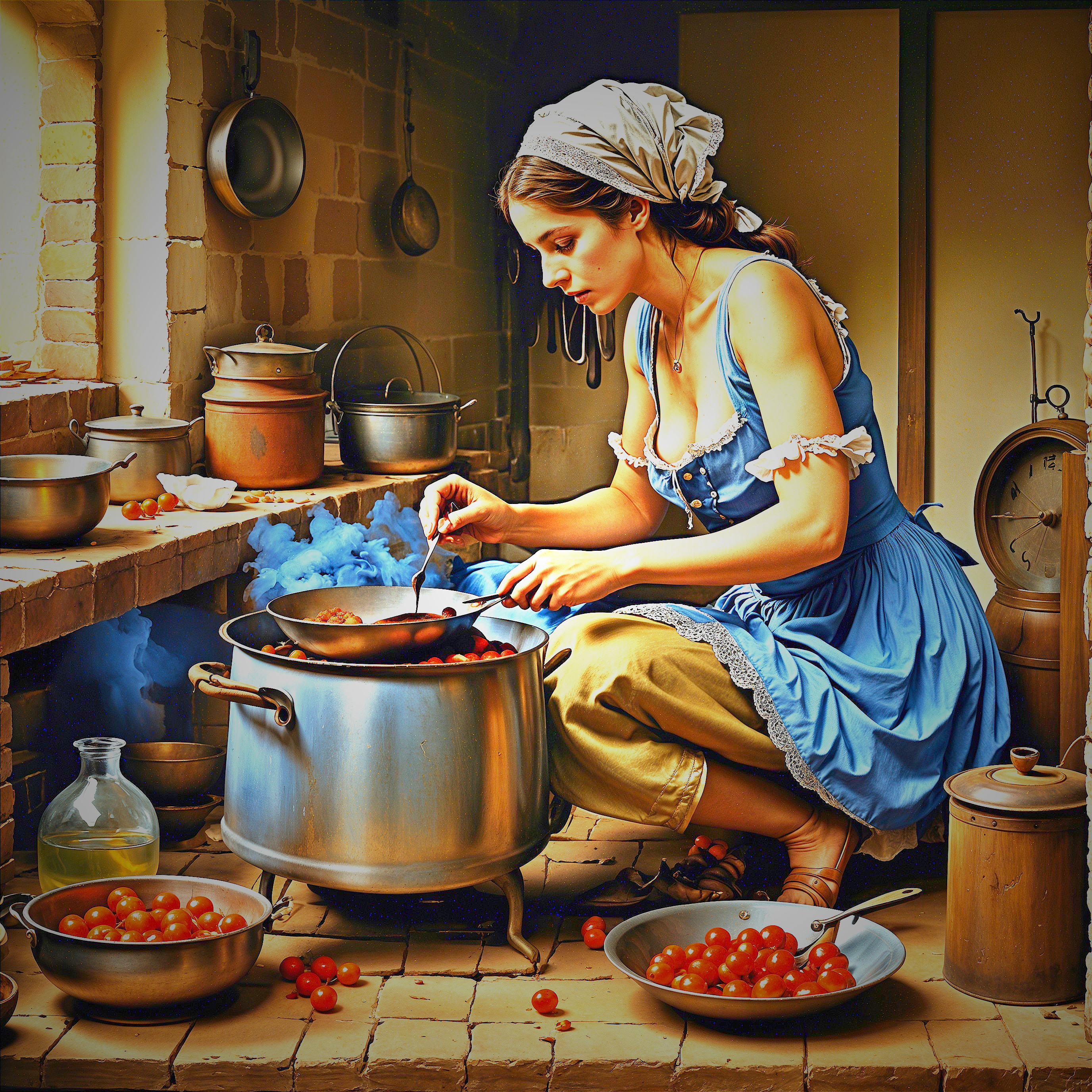 A woman in a blue dress and headscarf stirs a pot on a stove in a rustic kitchen, surrounded by cooking utensils and fresh tomatoes. The scene exudes a warm, homely atmosphere.
