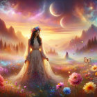A serene landscape features a woman in a flowing dress, standing amidst vibrant mountains and colorful skies. Swirling clouds and butterflies create an enchanting, dreamy atmosphere.