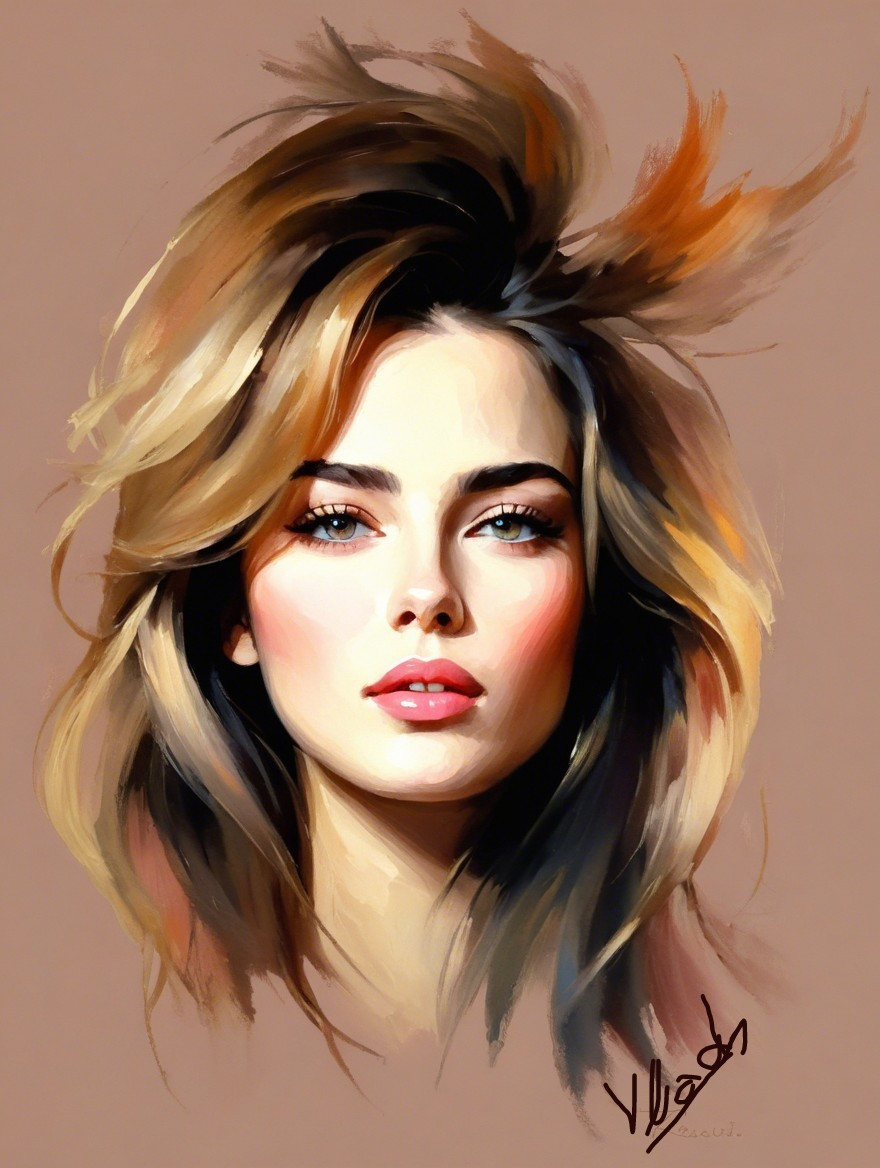 A stylized portrait of a woman with vibrant, flowing hair and striking blue eyes. Her soft, natural makeup enhances her features, creating a captivating and artistic appearance.