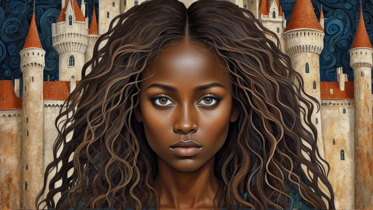 Prompt: "Ethereal female portrait,rich brown hair, eyes and dark skin. Castle, surreal and impossible perspective, intricate details, dreamlike atmosphere, magical elements, whimsical touches, vibrant color palette, intricate patterns, flowing hair, expressive eyes, fusion of realism and fantasy, Scott Bergey, Squeak Carnwath, Stasia Burrington influences, fine art quality, digital painting, high resolution, soft and diffused lighting, intricate textures, enchanting and thought-provoking, Artstation showcase."